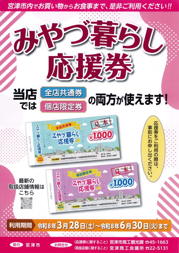 令和8年3月28日から令和8年6月30日まで宮津市内でお買い物からお食事まで使える「みやづ暮らし応援券」